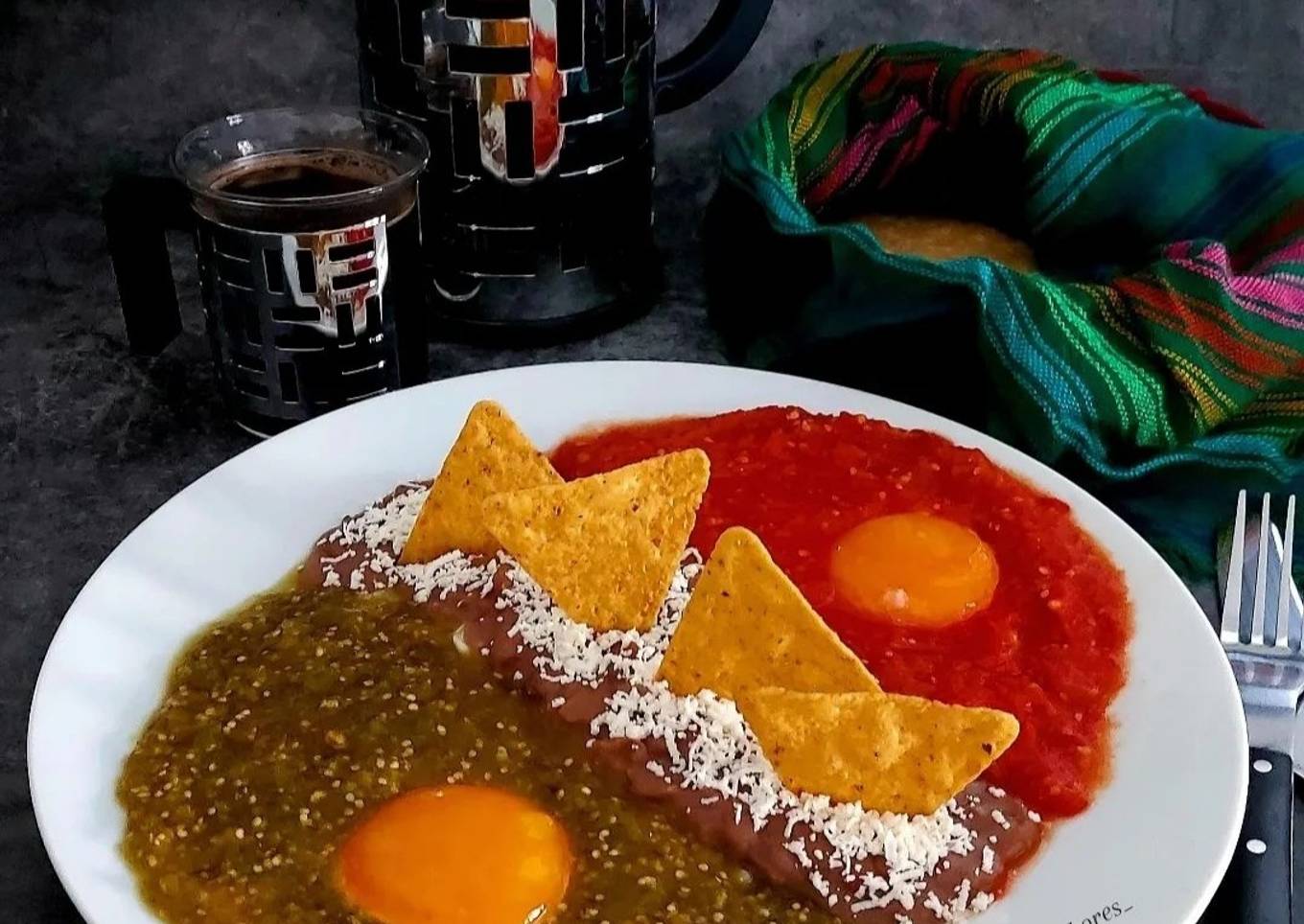 - Es un platillo que consiste en dos #huevosestrellados que se colocan sobre tortillas de maíz (ligeramente fritas) Separados por una barrera de frijoles con quesito y para remarcar que no hay reconciliación posible 😔, se bañan por separado en #salsapicante 🔥 uno con #salsaroja y el otro con #salsaverde, acompañados con tortillas para mojar en la yema y café para empezar el día con todo 💪#yaesviernesyelcuerpolosabe 💃🏻