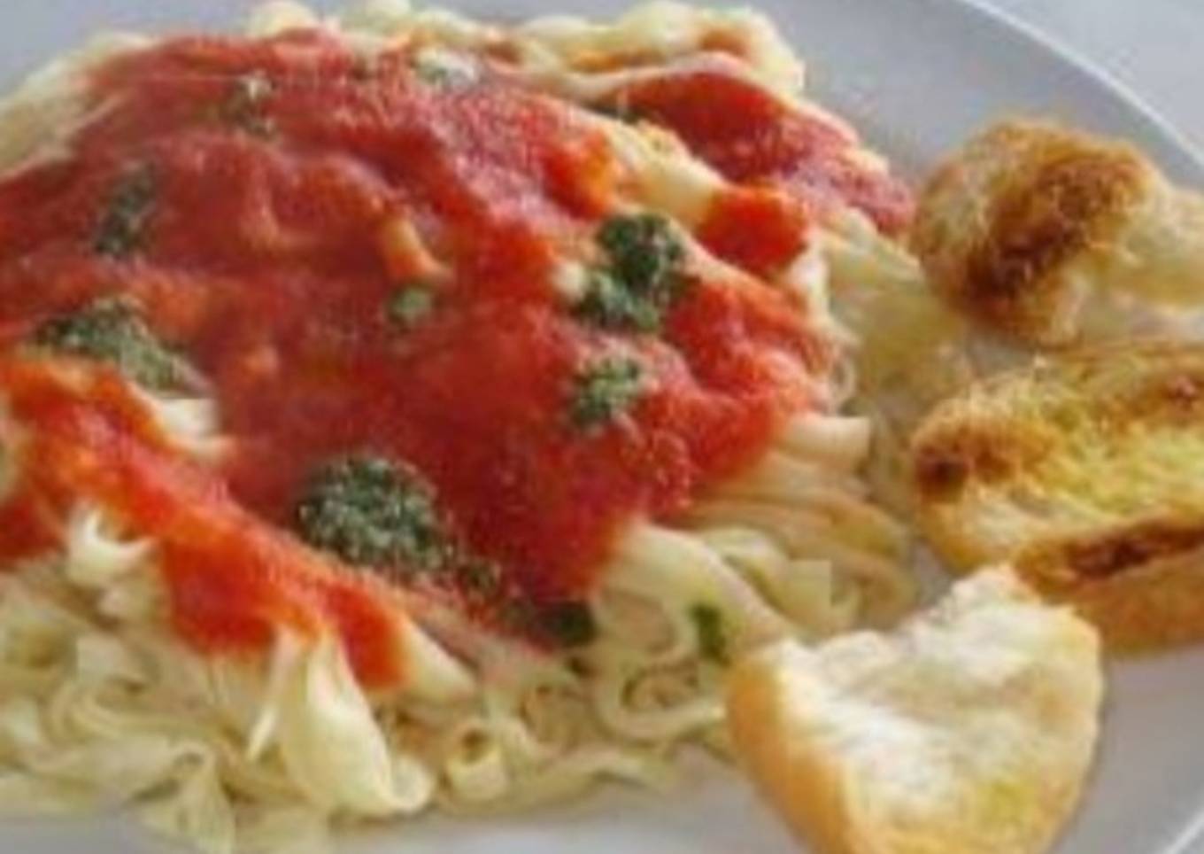 - Servir al plato la pasta, bañarla con salsa de tomate tradicional y acompañada de pan a la mantequilla, agregarle el pesto verde (si lo tiene)