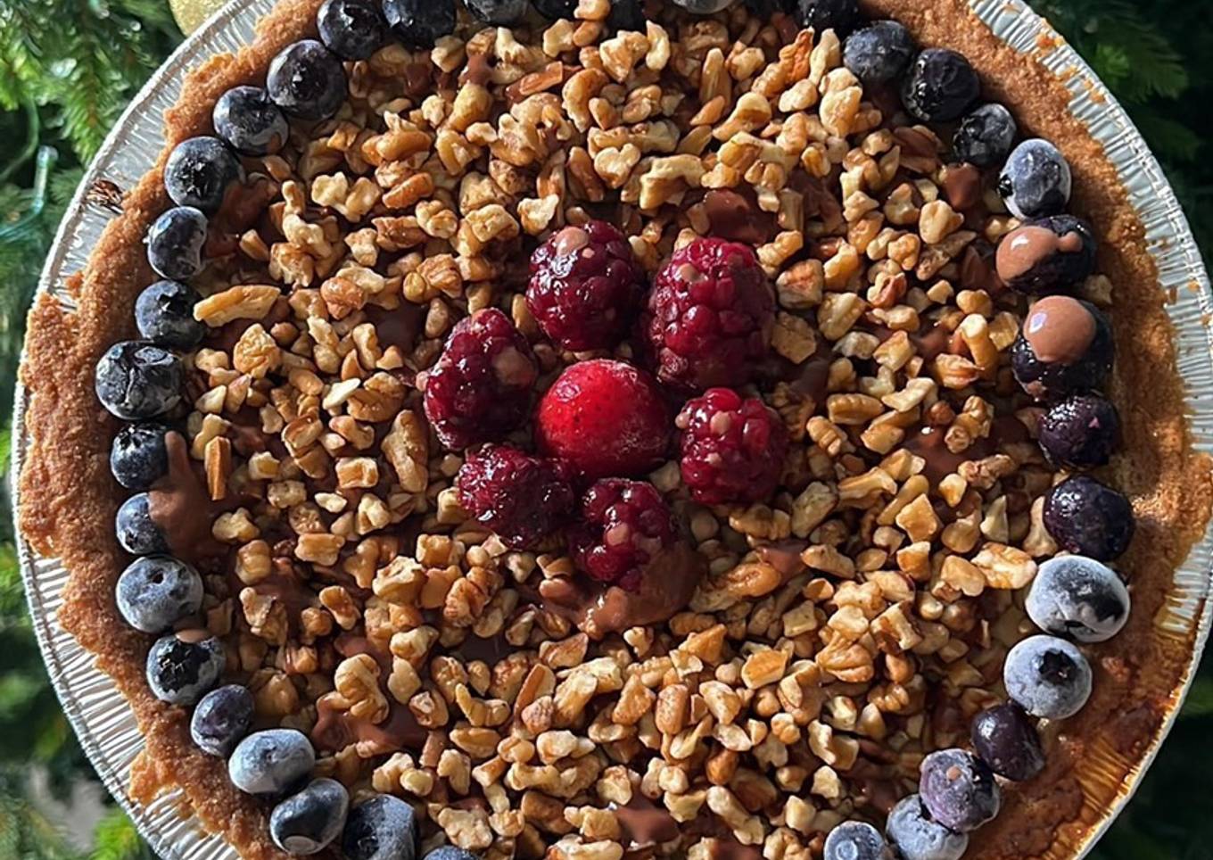 - Colocar en forma de círculo el chocolate derretido para que se peguen los arándanos, colocarlos en forma de círculo y posterior agregar nuez 🌰 triturada.