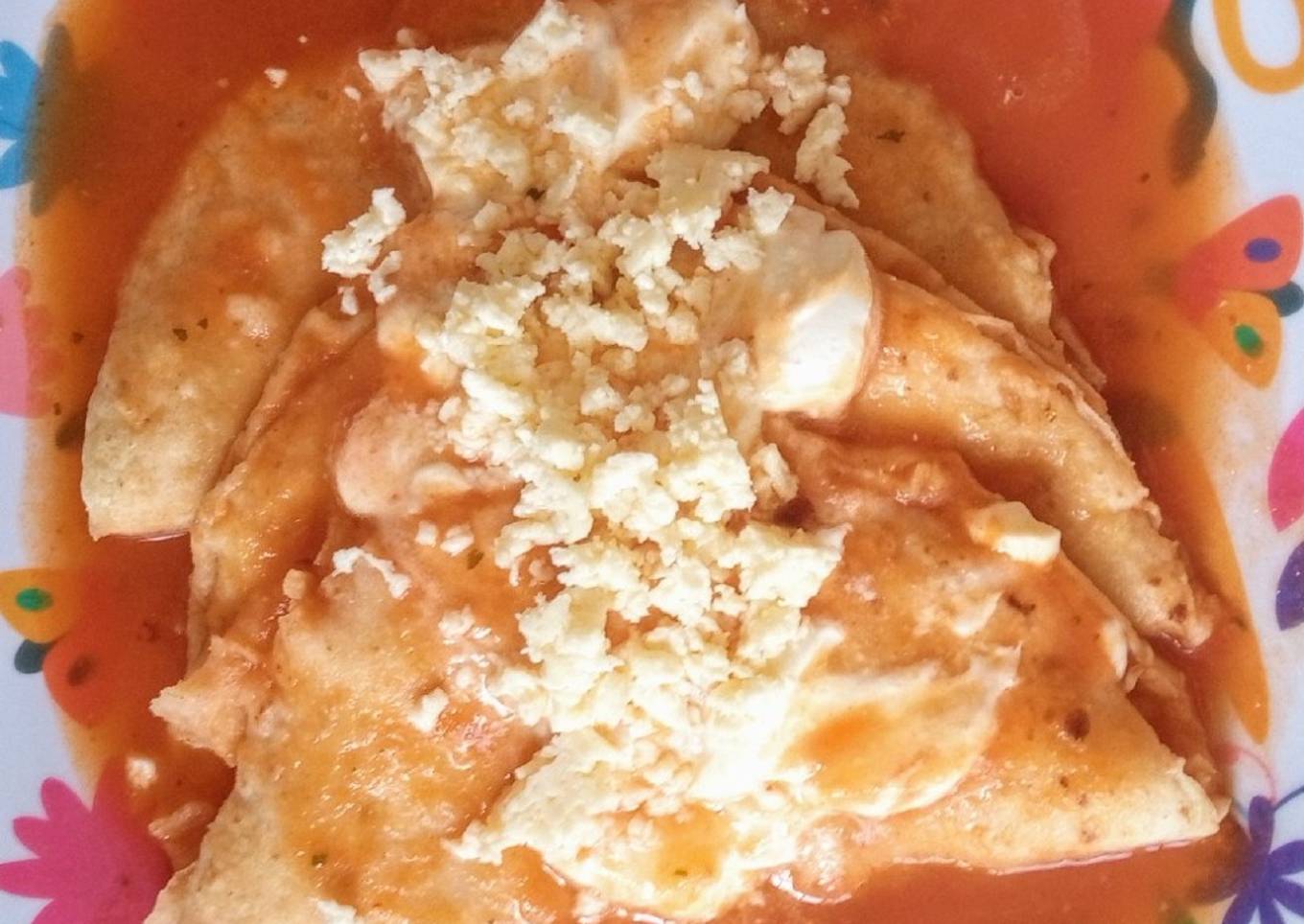 - Remoja la tortilla con la salsa de tomate. Corta el queso.