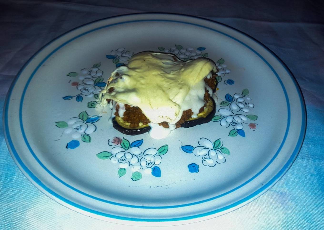 - Monta la salsa boloñesa encima de las berenjenas a la plancha, para después balar con salsa bechamel, y decorar con una costra de quesillo gratinado encima.