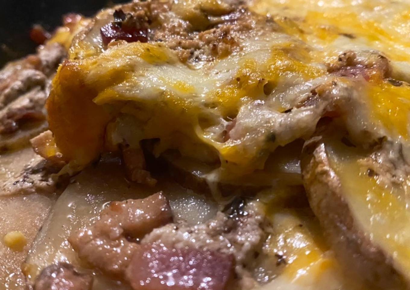 - Para montar el pastel, acomodar por capas la salsa, la papa y el tocino hasta llenar el molde o en este caso el sartén y coronar con el queso para gratinar