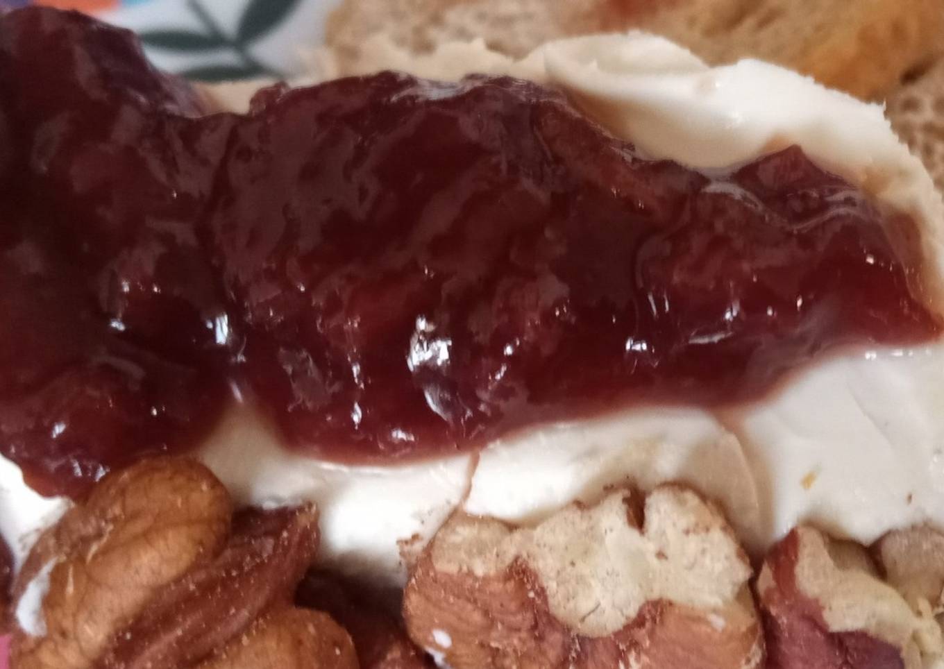 - Coloca el queso en un platón y coloca la mezcla de mermelada con chipotle, puedes agregar nueces a un lado del queso, y ya!