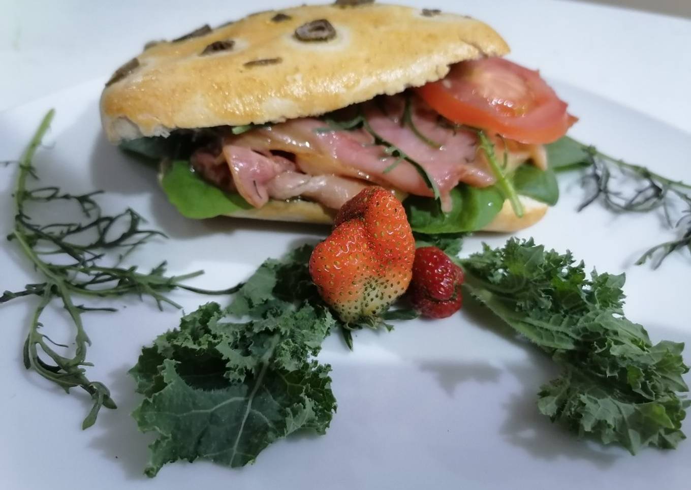 Ciabatta artesanal de Jamón serrano, tocino, queso manchego, mizuna, kale, arúgula, espinacas y tomate.