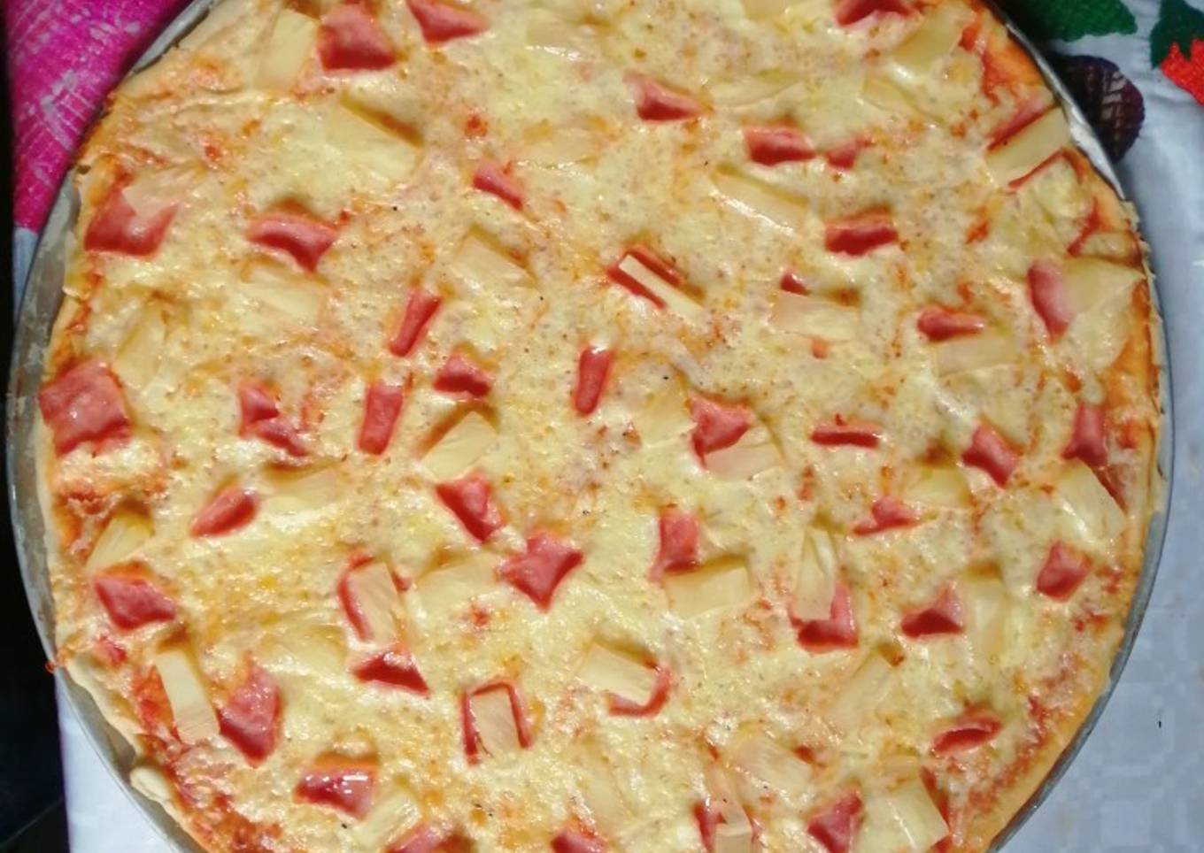 - Ir agregando la salsa de tomate, el queso, así como el jamón y la piña a la pizza
