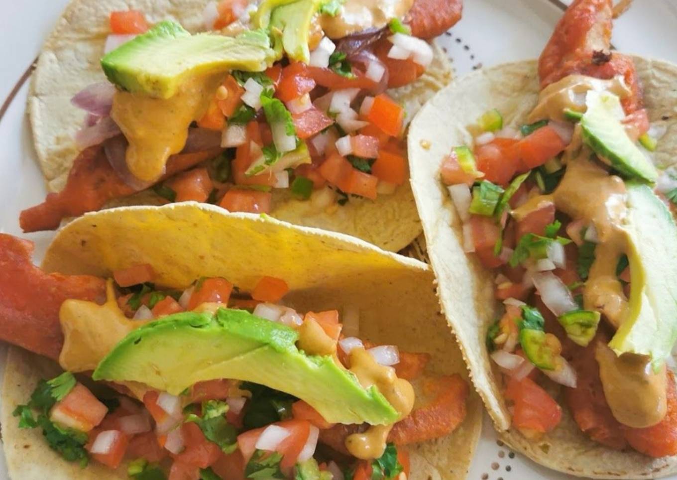 - Hacer los tacos y servir con pico de gallo, cebolla morada, aguacate y el aderezo