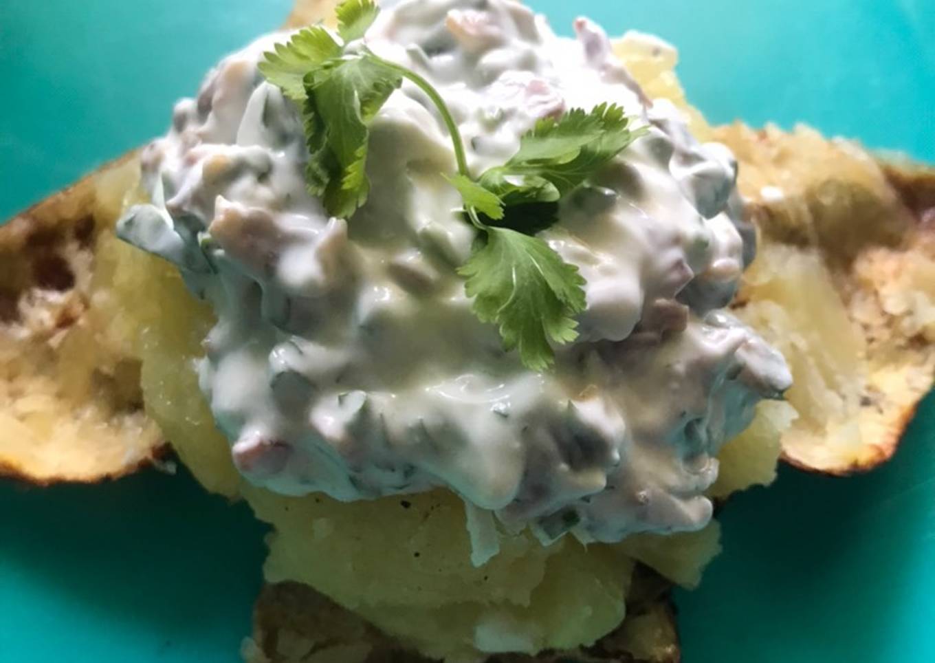 - Mezclar la crema, tocino y perejil y servir encima de la papa
